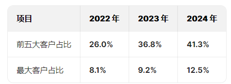 公司客户集中度较高,且呈上升趋势。2022年前五大客户贡献总收益26.0%,2023年升至36.8%,2024年进一步升至41.3%。最大客户贡献度也从2022年的8.1%升至2024年的12.5%。客户集中度过高,若主要客户减少订单或终止合作,将对公司经营业绩产生重大不利影响。